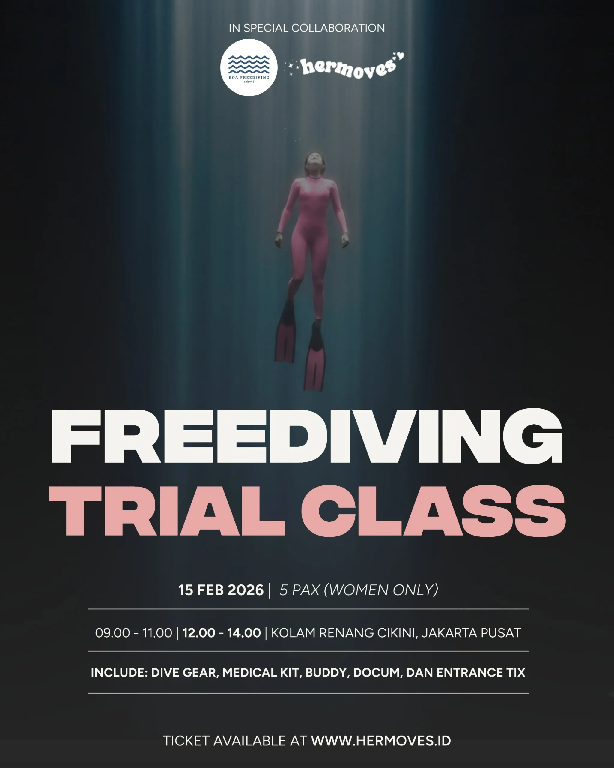 Your breath, your pace! Breathe. Dive. Flow. 🌊🐬✨ 📍 Kolam Renang Cikini, Jakarta Pusat 🗓 15 February 2026 🕖 12.00-14.00 👩‍🦳 Woman Only | 5 Pax