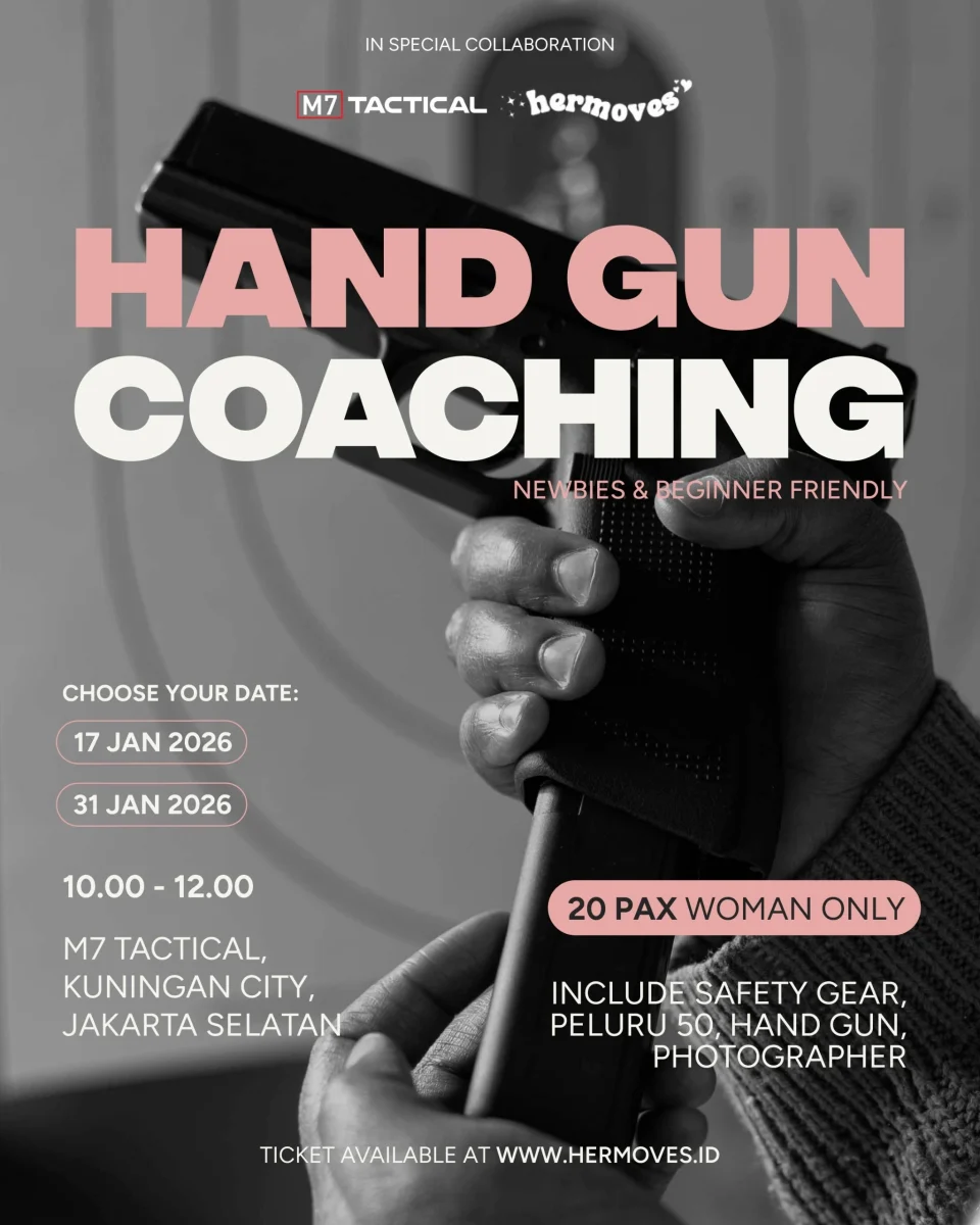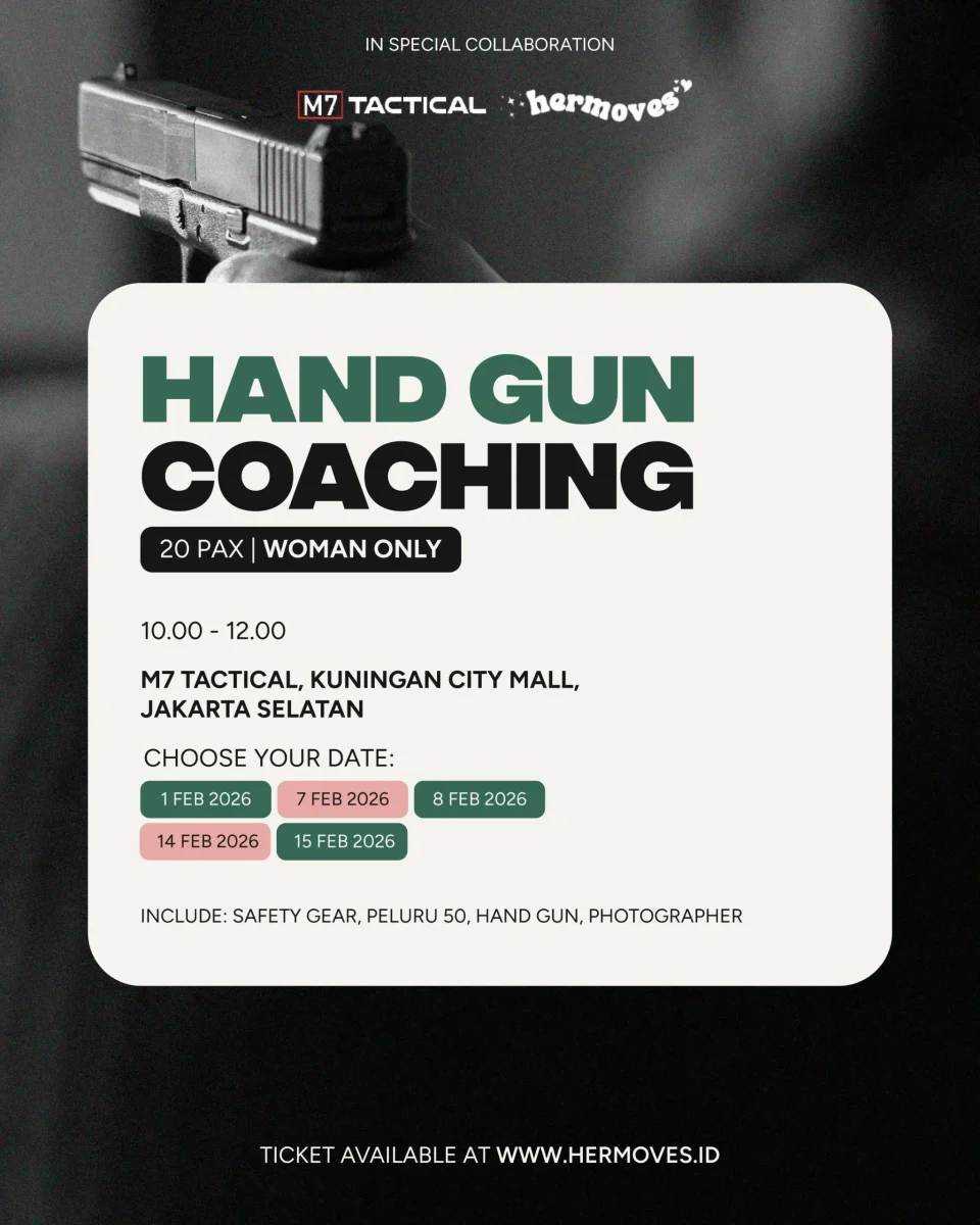 Beginner shooting coaching and learn proper technique, safety, and control. WOMEN ONLY 📅 1 February 2026 📍 Gandaria City Mall, Jakarta Selatan 💥 Include 45 Peluru ⏰ Session Options: • Sesi 3 — 13.00–14.00