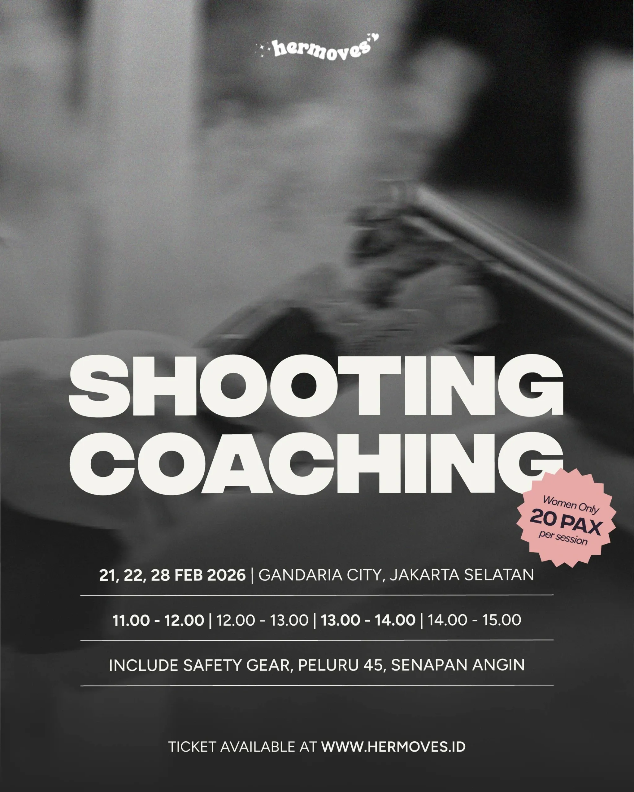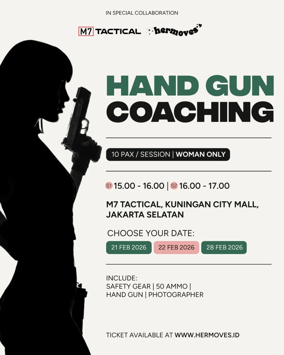 Beginner shooting coaching and learn proper technique, safety, and control. WOMEN ONLY πŸ“… 22 February 2026 πŸ“ Gandaria City Mall, Jakarta Selatan πŸ’₯ Include 45 Peluru ⏰ Session Options: β€’ Sesi 4 β€” 14.00–15.00