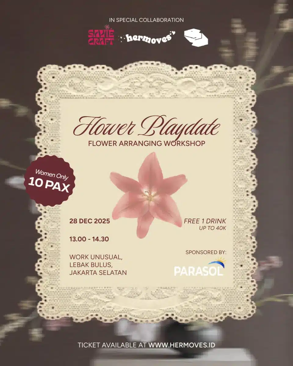 Bloom, sip, and create something beautiful 📅 28 Desember 2025 | 11.00–12.30 📍 Work Unusual Coffee, Lebak Bulus, Jakarta Selatan 👩‍ 10 Pax | Woman Only 🍹 Free 1 Beverage (up to 40k)